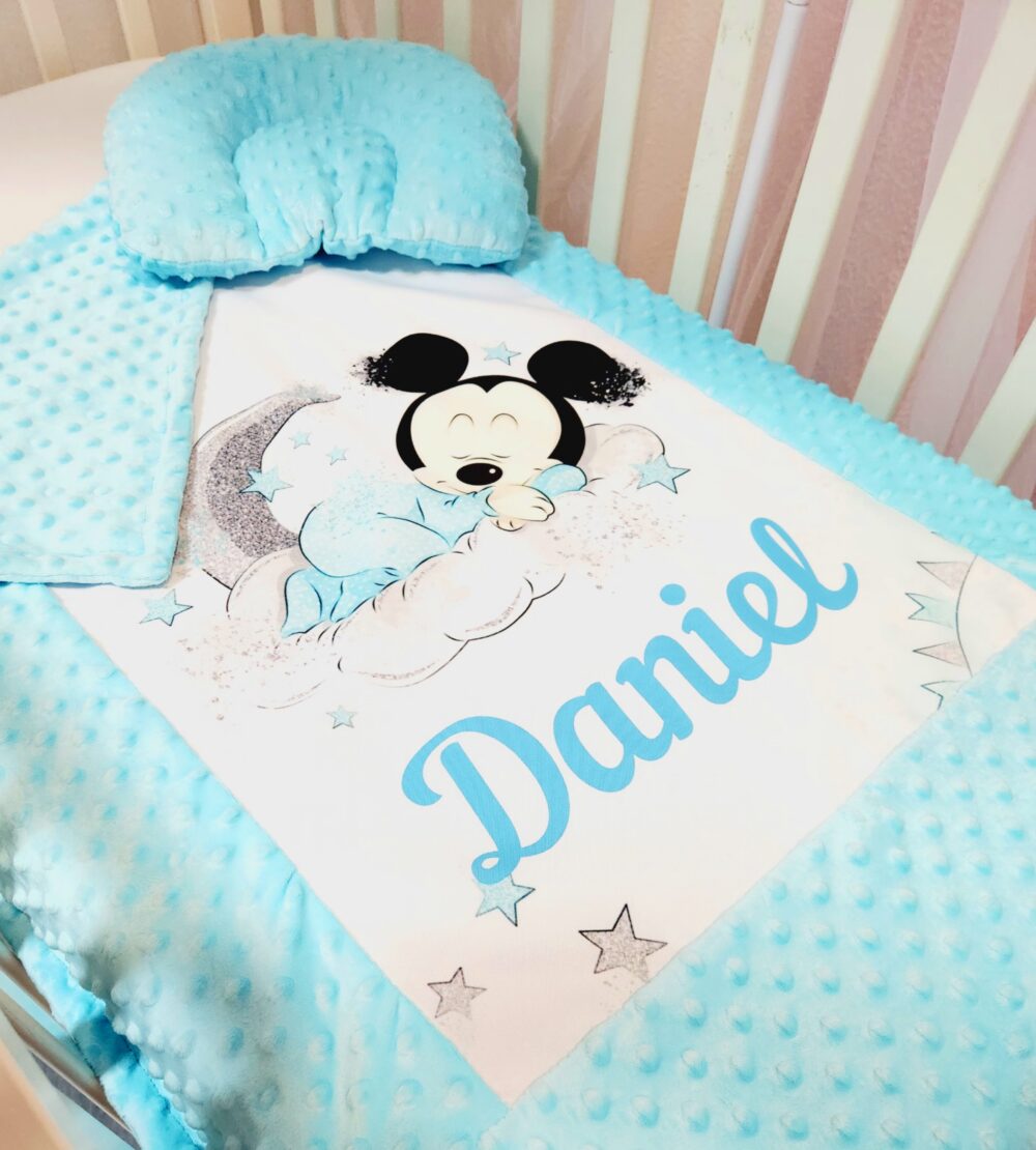 Conjunto Manta Minky + Almofada ortopédica Mickey verde agua